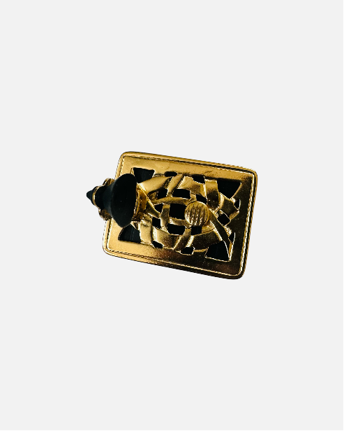 Ces boucles d’oreilles Yves Saint Laurent vintage ont été réalisées en métal doré et ornées d’un cabochon rectangulaire noir. Leur forme géométrique épurée et leur contraste doré/noir en font une pièce intemporelle.
