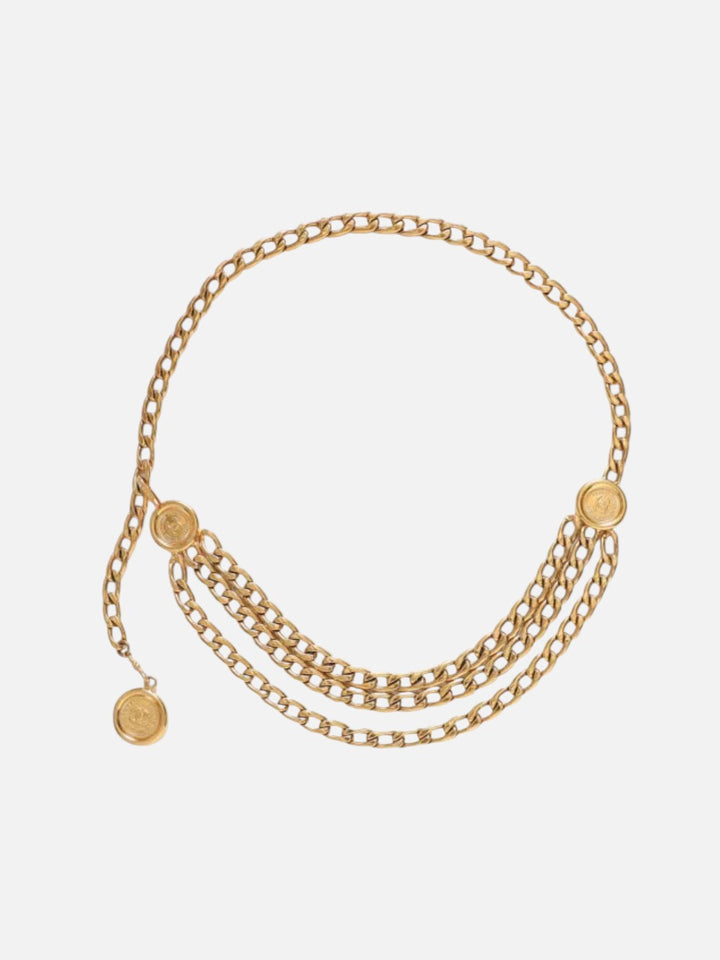 Cette ceinture Chanel vintage 1984 (Karl Lagarfeld) s’attache sur les hanches comme un bijou, grâce à ses trois rangs de chaînes dorées savamment entrelacées, rehaussée de médaillons siglés “CC” qui oscillent au moindre mouvement.