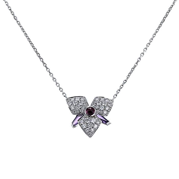 Ce collier Caresse d’Orchidée se distingue par son pendentif en forme d’orchidée sertie de diamants, améthystes et tourmaline, suspendu à une chaîne raffinée.