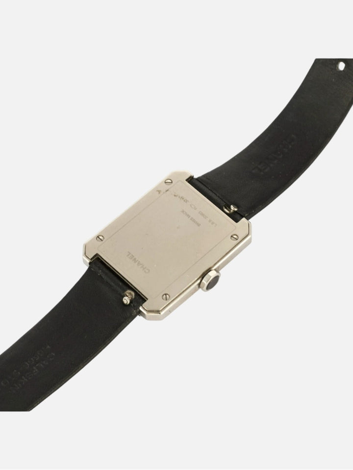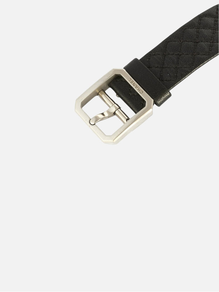 • Bracelet : cuir de veau noir, motif matelassé (rappel du célèbre matelassage Chanel), avec boucle ardillon en acier