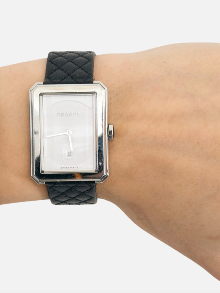 La BOY·FRIEND de Chanel brouille élégamment les frontières entre le masculin et le féminin. Son boîtier rectangulaire aux angles légèrement adoucis évoque tant la rigueur des lignes d’un vestiaire masculin que la sensibilité de la haute couture. Le cadran opalin guilloché capte la lumière, tandis que le bracelet en veau noir matelassé rappelle les iconiques sacs Chanel.