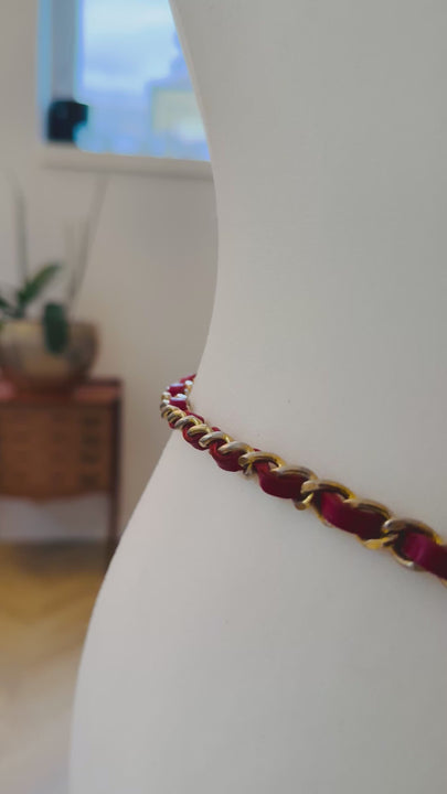 Le maillage doré est délicatement entrelacé d’un ruban de cuir rouge profond. Le bijou se termine par un médaillon martelé orné du logo CC embossé, symbole emblématique du luxe à la française.