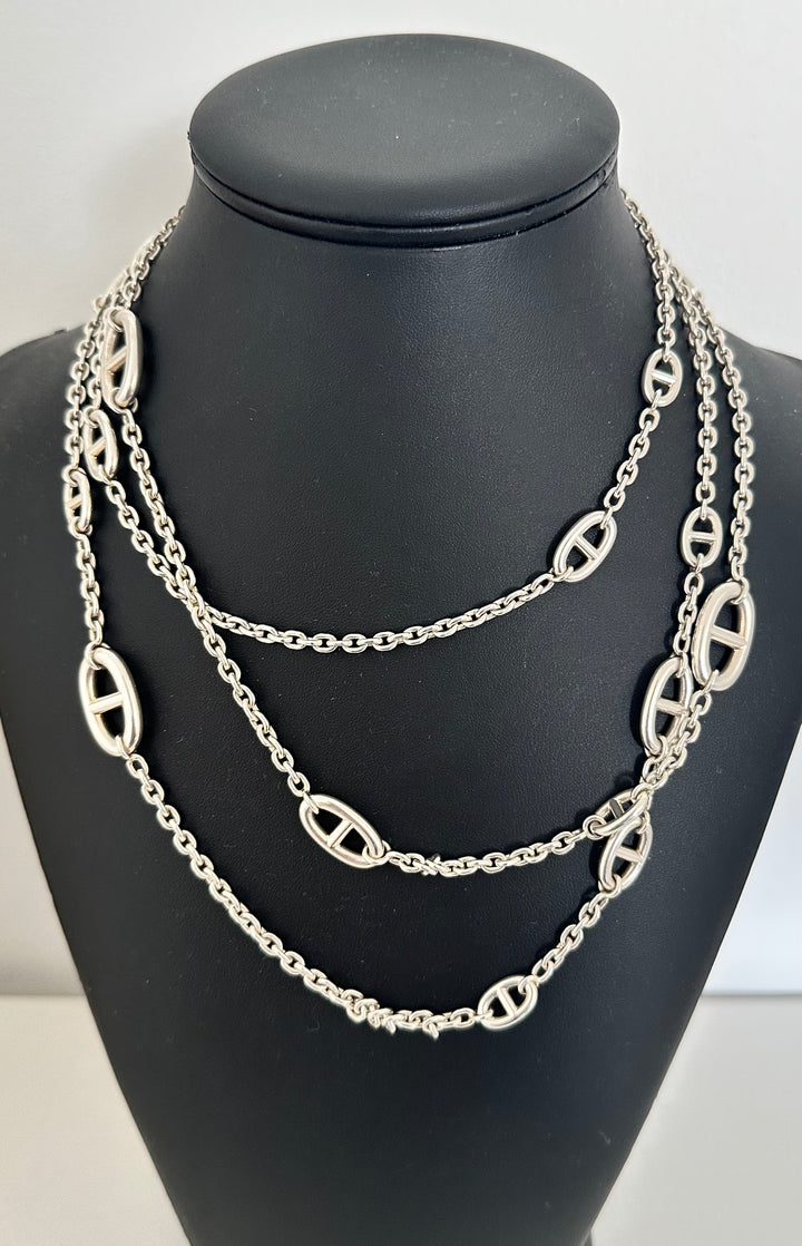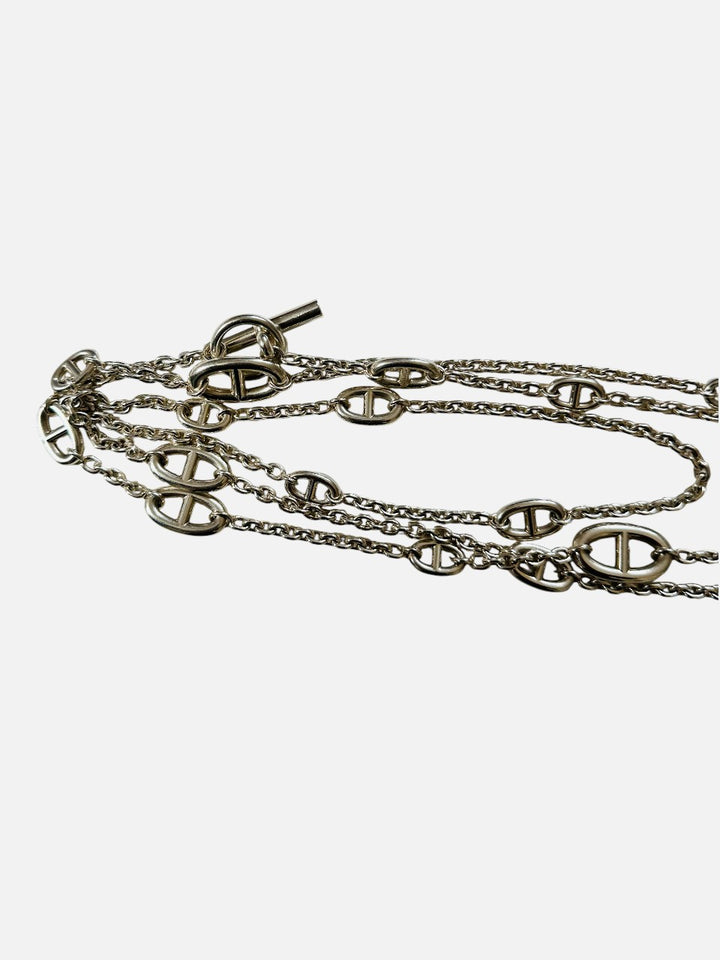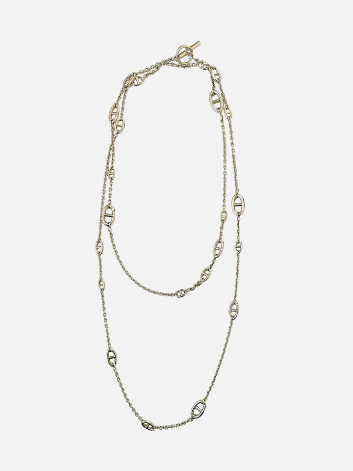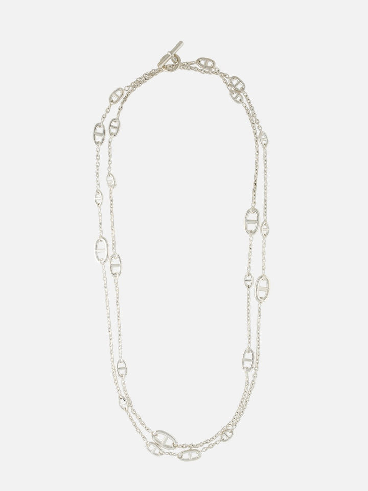 Le collier Farandole 120 vient de l’univers maritime de la Chaîne d’ancre. Son enchaînement raffiné de maillons argentés et de mailles variées crée un effet puissant. Long de 120 cm, il se porte de multiples façons : en tour simple, en double ou comme long sautoir.