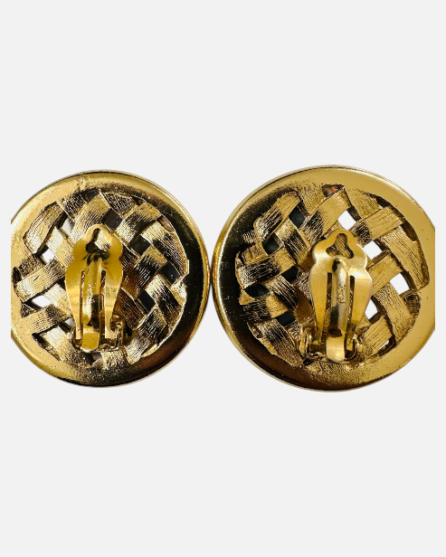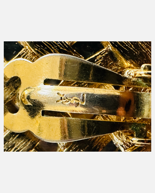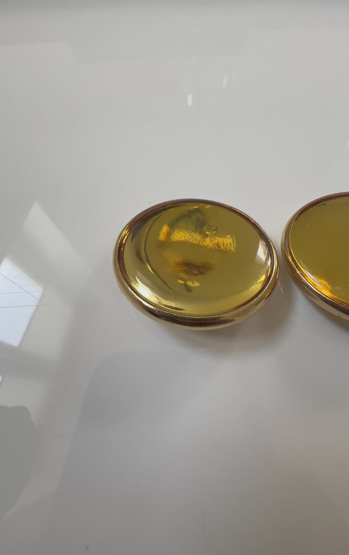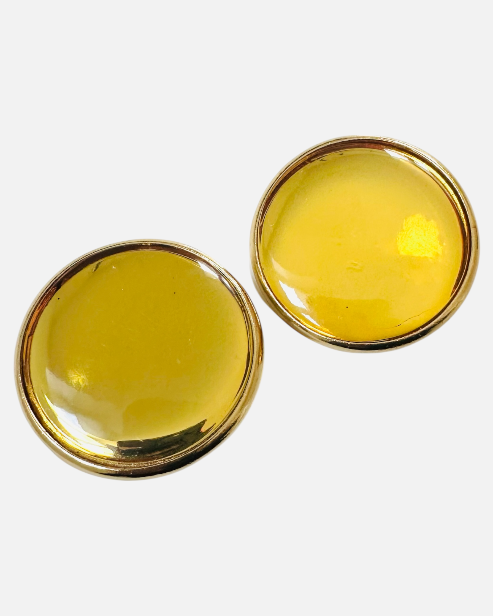 Paire de boucles d’oreilles Yves Saint Laurent des années 1980, ces clips ronds sont réalisés en métal doré et ornés d’un cabochon bombé en verre ambré. Une création vintage à la fois chic et minimaliste, représentative du glamour des collections YSL de l’époque.