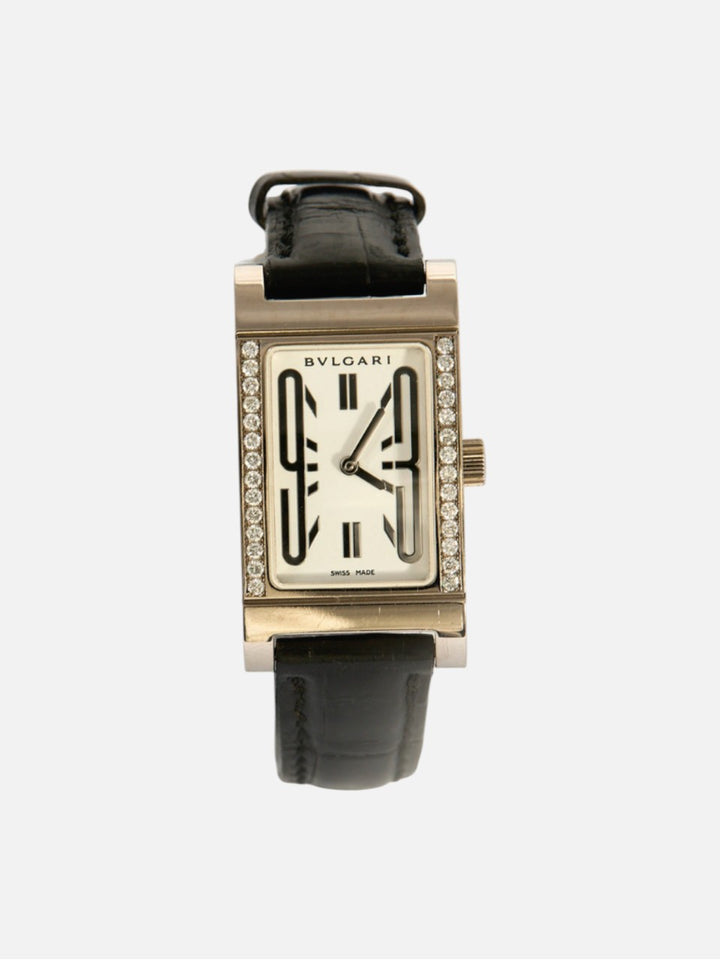 Cette Rettangolo de Bulgari est une pièce de haute joaillerie-horlogerie. Le boîtier en or blanc 750, entouré d’un entourage diamanté, lui donne une aura qui capte le regard. Le bracelet en cuir noir Hermès, et le mouvement quartz.