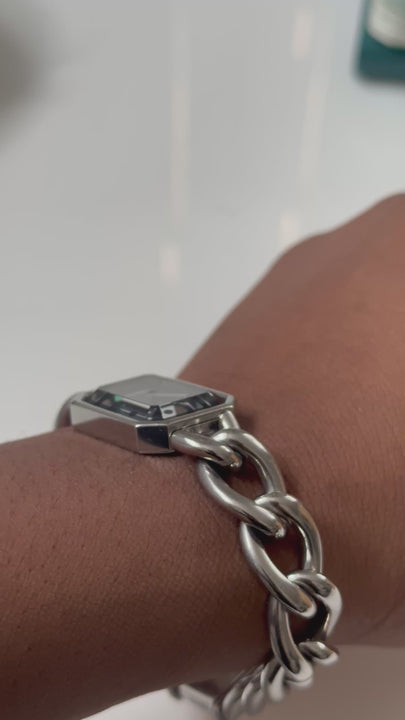 La Chanel Première « Gourmette » réinterprète l’iconique montre Première dans une version entièrement en acier palladié, au style épuré et contemporain. Son design monochrome argenté souligne l’élégance intemporelle de la Maison, tandis que son bracelet gourmette lui apporte une allure plus structurée et affirmée.