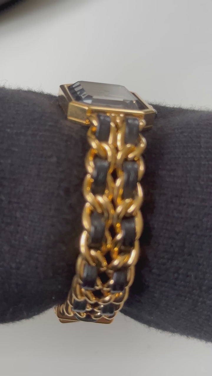 La montre Chanel Première en plaqué or est inspirée de la silhouette octogonale du flacon du N°5, elle reflète l’esprit visionnaire de Gabrielle Chanel. Son boîtier en acier plaqué or 18 carats (0,1 micron) et son bracelet en maille chaîne entrelacée de cuir noir créent un contraste saisissant.