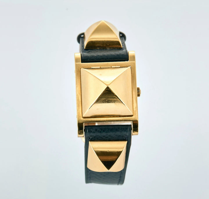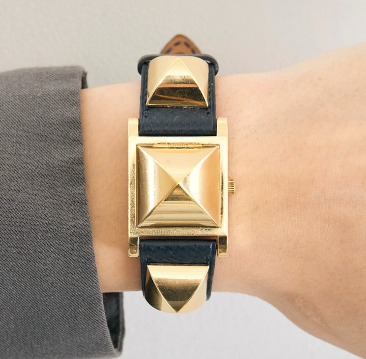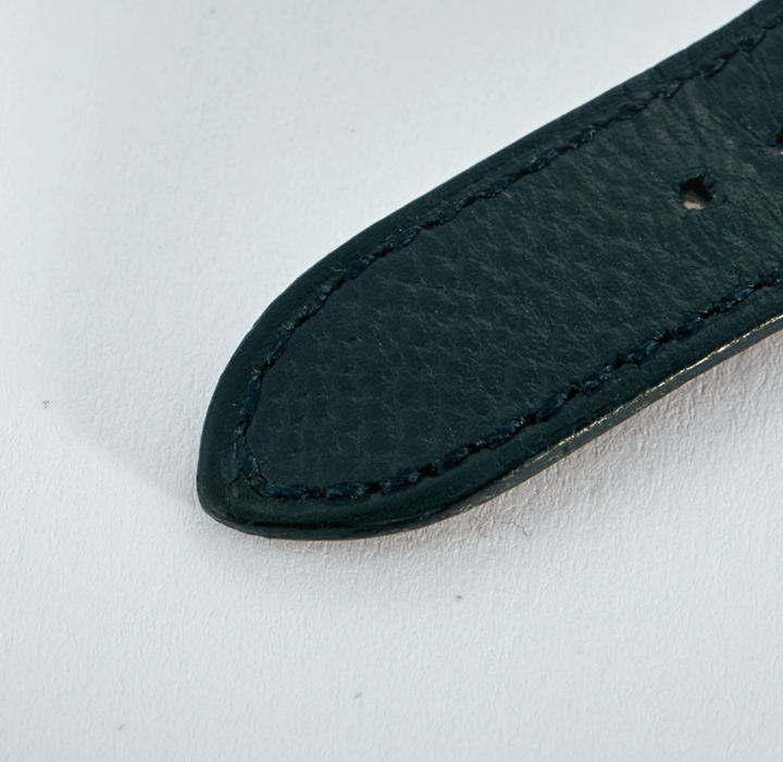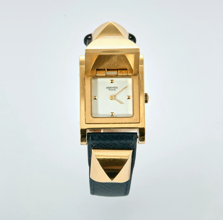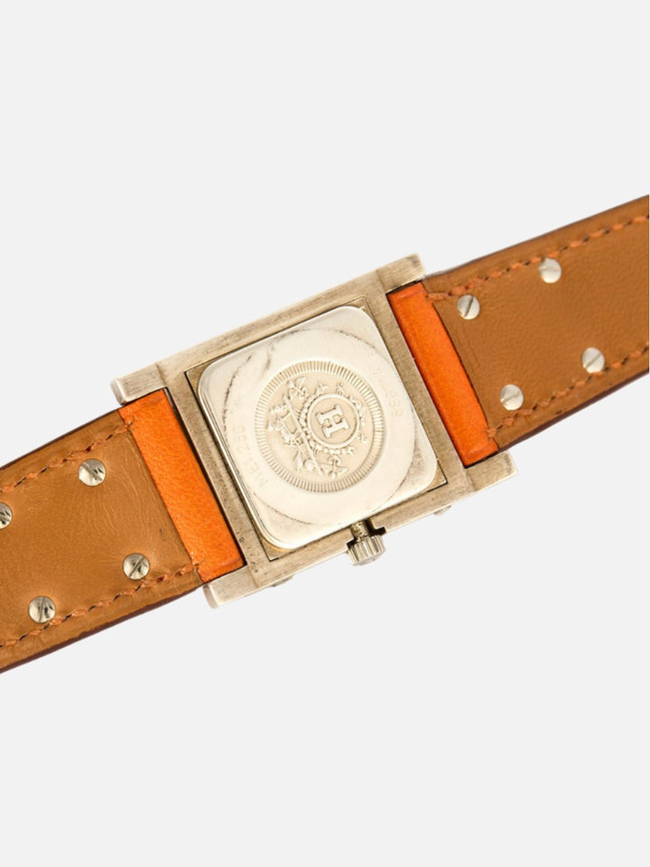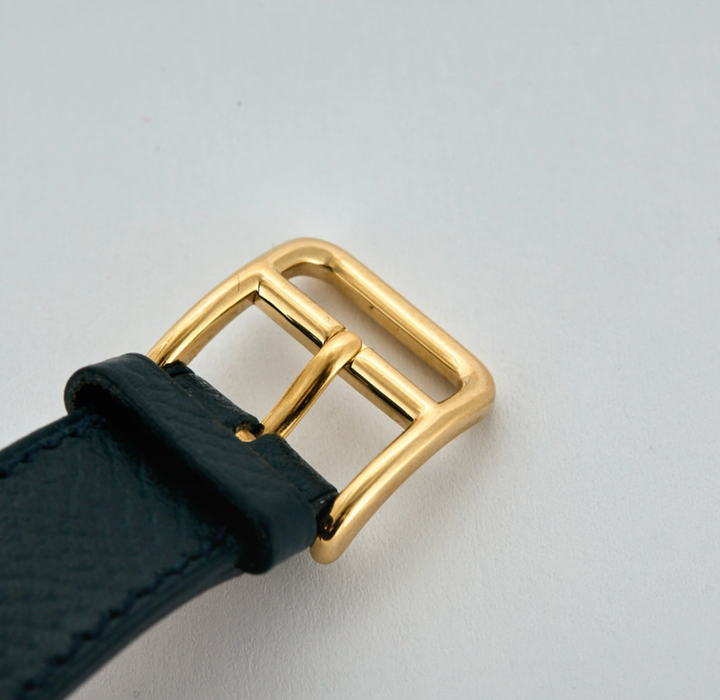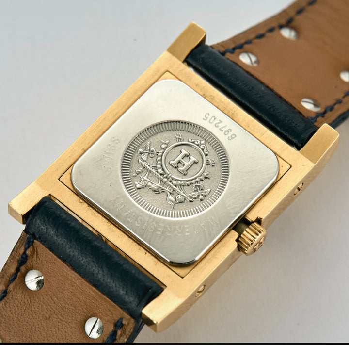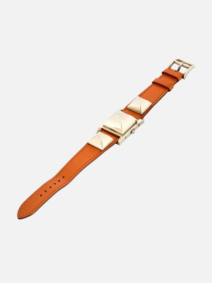 Son boîtier en argent dissimule un cadran au style épuré, tandis que le bracelet en cuir, d’origine Hermès, apporte une touche de caractère inimitable.