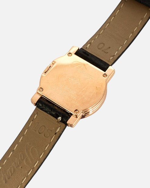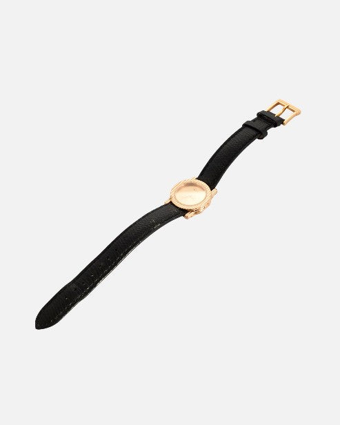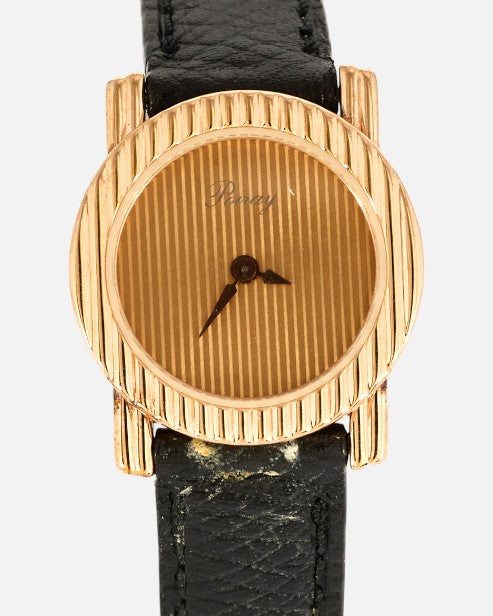 Cette montre Poiray Ma Première séduit par son design raffiné et féminin. Réalisée en plaqué or, elle présente un cadran doré à fines rainures verticales. Son bracelet en cuir noir d’origine.