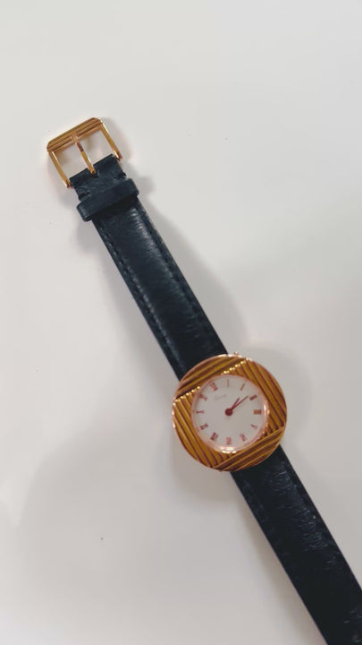 Ce modèle vintage plonge le temps dans l’univers joaillier de la maison, avec son boîtier plaqué or qui capte la lumière, tandis que le bracelet en cuir noir d’origine apporte une touche de raffinement sobre.