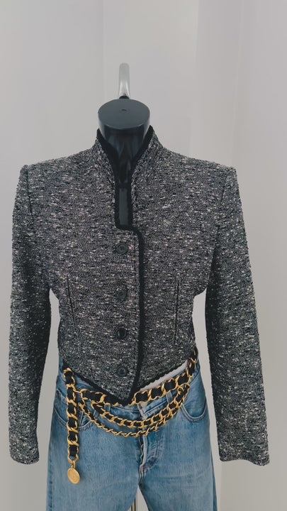 Cette veste Yves Saint Laurent séduit par sa coupe courte et ajustée structure la silhouette. Elle a été réalisée dans un tissu gris chiné au rendu texturé et raffiné.